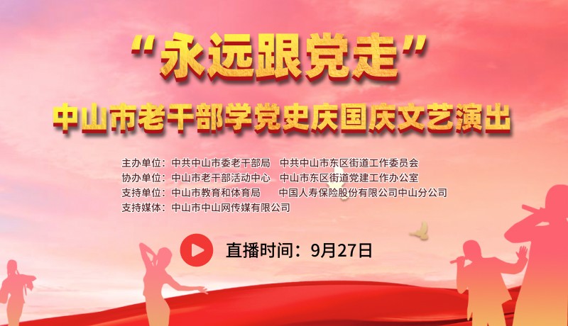 為深入學習貫徹習近平總書記“七一”重要講話精神,深化黨史學習教育成果,慶祝中華人民共和國成立72周年,展示新時代老干部的精神風貌。市委老干部局和東區(qū)街道黨工委聯(lián)合主辦的“永遠跟黨走”中山市老干部學黨史慶國慶文藝演出于9月27日舉行,中山網(wǎng)將全程直播,敬請關(guān)注。