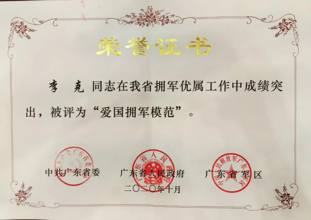 李克說,獲得“廣東省愛國擁軍模范”稱號殊榮,是他一生的榮光,他將始終保持著感恩的心,視榮譽如生命,繼續(xù)秉承老一輩的光榮傳統(tǒng),擦亮退役軍人真本色,全面推廣紅色基因和革命光榮傳統(tǒng)教育?!爸灰獓液腿嗣袢罕娪行枰覍⒘x無反顧沖鋒在前當‘尖’兵。”