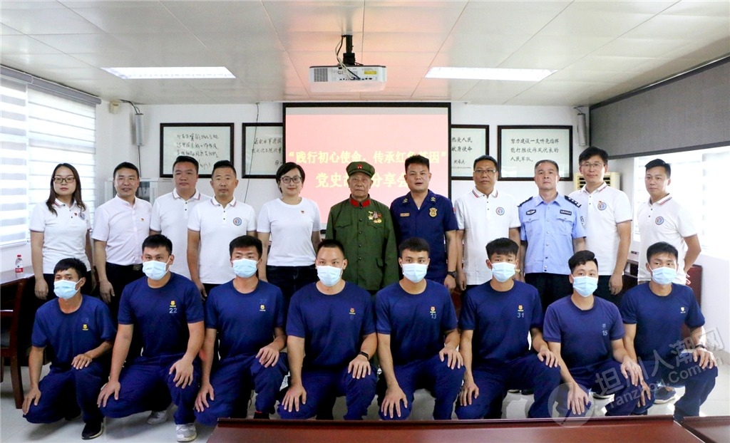 感人至深的英雄事跡,使與會黨員干部沉浸其中,深刻感受到了每一枚紅色勛章所承載的歷史記憶。中隊消防員、坦洲鎮(zhèn)民兵海防巡邏排排長黃俊謙說:“聆聽了鄭叔生動的紅色故事,我備受鼓舞,作為一名基層消防員和民兵骨干,在今后的工作中我要發(fā)揚革命前輩的優(yōu)良傳統(tǒng),爭做時代新人,為坦洲消防救援事業(yè)和海防應急搶險工作貢獻自己的青春和熱血!” ▲與會人員和參戰(zhàn)老兵鄭金洪合影留念