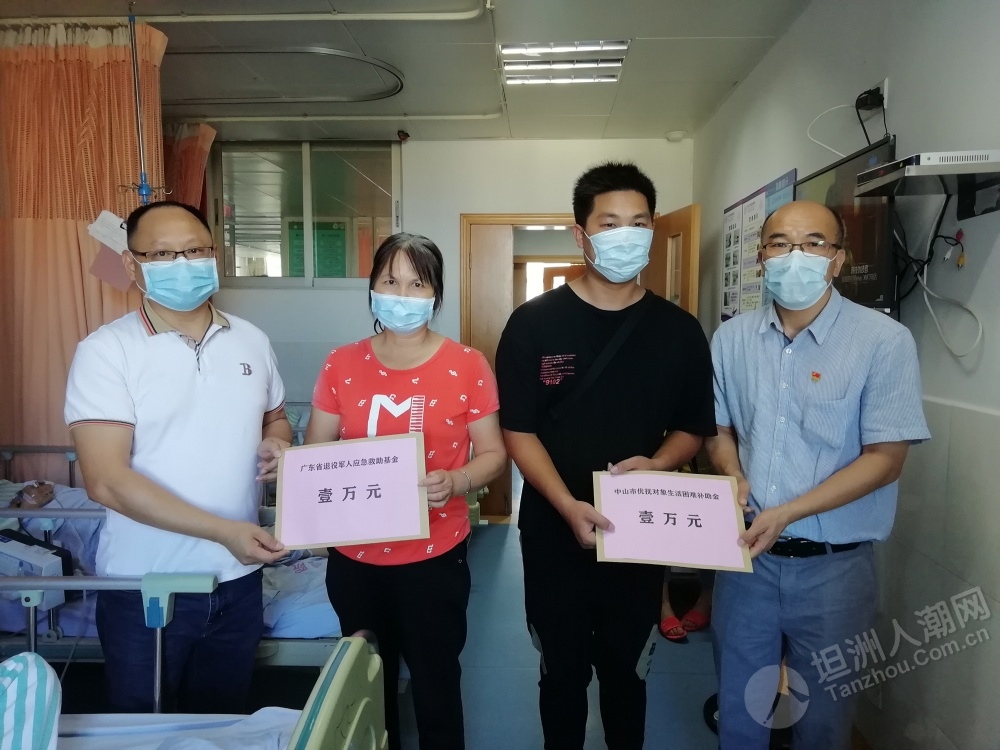 近日,中山市首個(gè)應(yīng)急救助資金申請(qǐng)已通過(guò)省退役軍人事務(wù)廳審核,坦洲籍退役軍人郭叔獲得了應(yīng)急救助資金1萬(wàn)元。該筆應(yīng)急救助資金于日前由省退役軍人事務(wù)廳按照規(guī)定程序撥付到申請(qǐng)人個(gè)人賬戶。 6月18日,中山市、坦洲鎮(zhèn)兩級(jí)退役軍人服務(wù)中心及坦洲社會(huì)事務(wù)局相關(guān)負(fù)責(zé)人一行到坦洲醫(yī)院對(duì)郭叔進(jìn)行慰問(wèn),告知他申請(qǐng)的應(yīng)急救助資金已由省退役軍人事務(wù)廳撥付到賬,叮囑他要聽(tīng)從醫(yī)生的囑咐,積極配合康復(fù)治療,樹(shù)立起戰(zhàn)勝疾病的勇氣和信心。郭叔家人特地制作了一面錦旗送到中山市退役軍人服務(wù)中心主任張波手中,由衷表達(dá)了對(duì)市、鎮(zhèn)、村各級(jí)退役軍人服務(wù)中心(站)的感激之情。