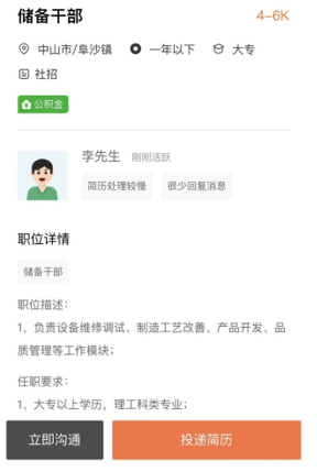 ▲求職者注冊流程 3、投遞簡歷 完善注冊信息后,即可跳轉至【2022年度珠中江區(qū)域退役軍人及隨軍家屬網絡招聘會】,點擊職位名稱可進入相應職位詳情頁,點擊企業(yè)可進入企業(yè)詳情頁,可查看企業(yè)發(fā)布的在線職位。 點擊職位詳情頁左下方【立即溝通】可和HR進行溝通,點擊右下方【投遞簡歷】即可完成投遞。