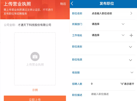 ▲企業(yè)注冊流程 2、發(fā)布職位 完善注冊信息后,即可進入到【企業(yè)會員中心管理后臺】,發(fā)布職位前【上傳營業(yè)執(zhí)照】,【通過審核后】即可發(fā)布職位,企業(yè)發(fā)布的符合條件的崗位將同步更新至【2022年度珠中江區(qū)域退役軍人及隨軍家屬網絡招聘會】