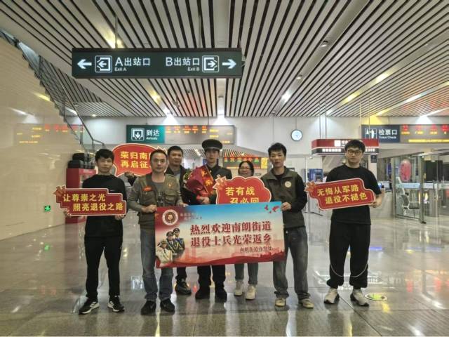 當(dāng)天,街道退役軍人服務(wù)中心工作人員早早守候在出站口,現(xiàn)場(chǎng)“熱烈歡迎退役士兵光榮返鄉(xiāng)”“榮歸南朗 再啟征程”等橫幅高懸,氣氛莊重而溫馨。當(dāng)身著戎裝、英姿颯爽的退役士兵陸續(xù)走出抵達(dá)通道,等候多時(shí)的工作人員與家屬立即上前,獻(xiàn)上鮮花、披上綬帶,用熱烈的掌聲和親切的問(wèn)候迎接最可愛(ài)的人回家。“辛苦了!”“歡迎回家!”一句句暖心話語(yǔ),驅(qū)散了旅途疲憊,更讓尊崇之光閃耀歸途。