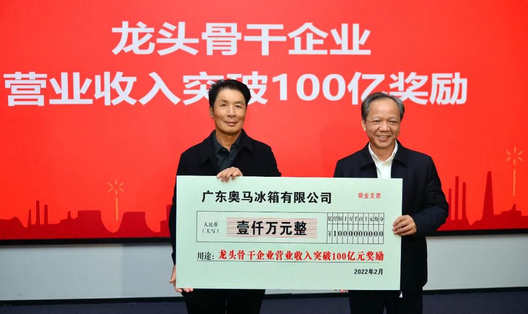 廣東奧馬冰箱有限公司是全球最大的冰箱ODM生產(chǎn)企業(yè),連續(xù)13年成為中國冰箱出口冠軍。去年底的一次調(diào)研,郭文海勉勵奧馬加快打造百億級企業(yè),并承諾目標(biāo)實(shí)現(xiàn)時(shí)前來為企業(yè)慶賀。2021年,奧馬不負(fù)眾望,營業(yè)收入超101億元,同比增長17%,首次突破百億大關(guān),繳納稅收5.5億元。