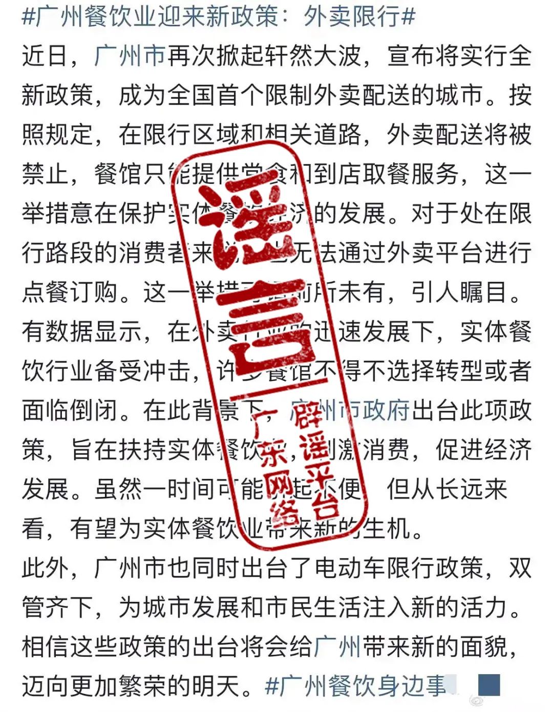 近日,有自媒體發(fā)布“廣州市將實(shí)行全新政策,成為全國首個限制外賣配送的城市”“限行區(qū)域和相關(guān)道路,外賣配送將被禁止,餐館只能提供堂食和到店取餐服務(wù)”,經(jīng)核查,上述信息嚴(yán)重不實(shí),惡意曲解廣州電動自行車限行新規(guī),誤導(dǎo)民眾,引發(fā)不良社會影響。