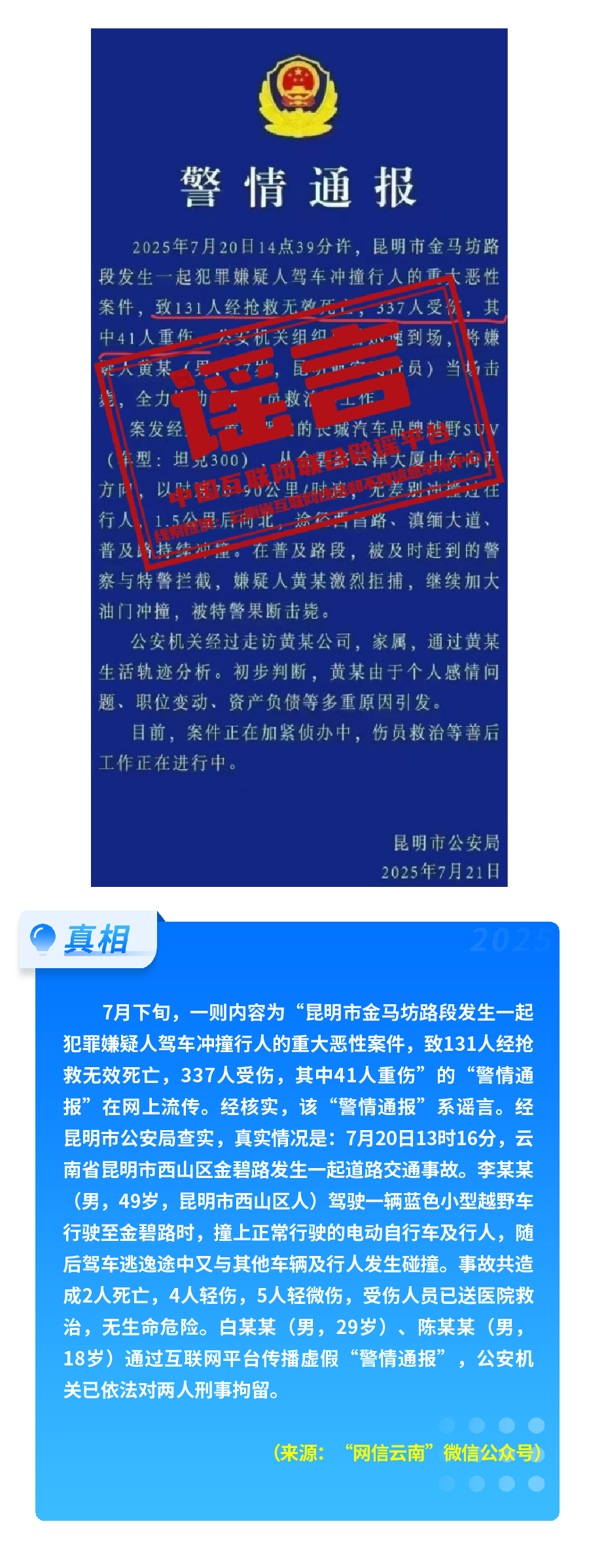 近期,網(wǎng)上接連出現(xiàn)發(fā)布虛假“警情通報”的惡性造謠傳謠案件,炮制傳播“昆明駕車撞人案131人死亡”“杭州自來水接入糞水”及涉釋永信虛假“警情通報”,模仿“藍底白字”格式,杜撰聳人聽聞細節(jié),損害政府公信力,嚴重擾亂社會秩序?!霸菏款A(yù)測廣東將發(fā)生8級以上大地震”公然偽造專家聊天截圖,謊報地震預(yù)警。還有造謠者借盛夏高溫酷暑與洪澇災(zāi)害,編造“安徽淮北、山東泰安等地多人因高溫死亡” “重慶大暴雨導(dǎo)致15人死亡、4人失蹤”等謠言,蹭炒熱點、煽動情緒。