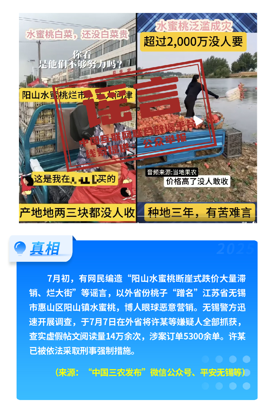 此外,7月份正值暑期旅游旺季和水果等農(nóng)產(chǎn)品收獲季,有自媒體、商家借機編造傳播涉文旅及農(nóng)產(chǎn)類謠言,干擾市場秩序,侵害消費者權(quán)益。有商家違規(guī)使用人民大會堂建筑圖片標識和名稱,仿冒人民大會堂賬號,非法售賣、倒賣參觀門票,損害游客權(quán)益。個別商家剪輯發(fā)布“江蘇無錫陽山水蜜桃斷崖式跌價、大量滯銷、爛大街”謠言視頻,再借機兜售假冒的陽山水蜜桃,博人眼球惡意營銷,擾亂市場秩序。所謂“峨眉山人猴大戰(zhàn),游客墜崖,猴王被當場擊斃”景區(qū)安全事件一度傳得沸沸揚揚,相關(guān)視頻以驚悚情節(jié)博取關(guān)注,畫面實際是用AI合成拼接制作。