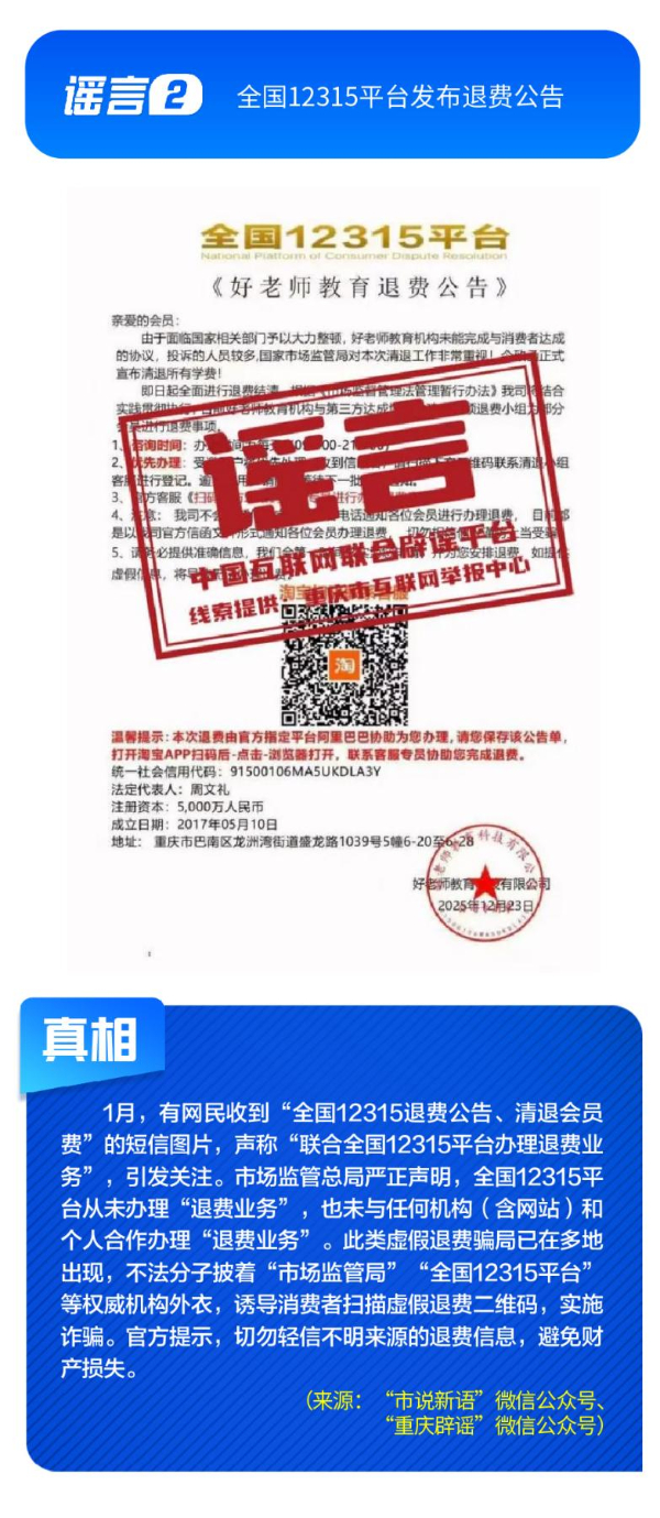 公共政策領(lǐng)域謠言誤導(dǎo)公眾決策?!吧绫?]有有效期限制、未到期不能換新卡”是對(duì)社??ü芾碚叩恼`讀,給民眾平添困擾;“28家博物館元旦期間閉館”實(shí)為少數(shù)博物館根據(jù)運(yùn)營安排所做的微調(diào),網(wǎng)帖嚴(yán)重夸大實(shí)際閉館情況,引發(fā)負(fù)面炒作;“深圳有望推行12年義務(wù)教育,高中免費(fèi)”是對(duì)現(xiàn)行政策的“超前編造”,誤導(dǎo)學(xué)生及家長群體;“全國12315平臺(tái)發(fā)布退費(fèi)公告”,則是假冒監(jiān)管機(jī)構(gòu)名義散播不實(shí)通知,為后續(xù)詐騙行為做鋪墊。