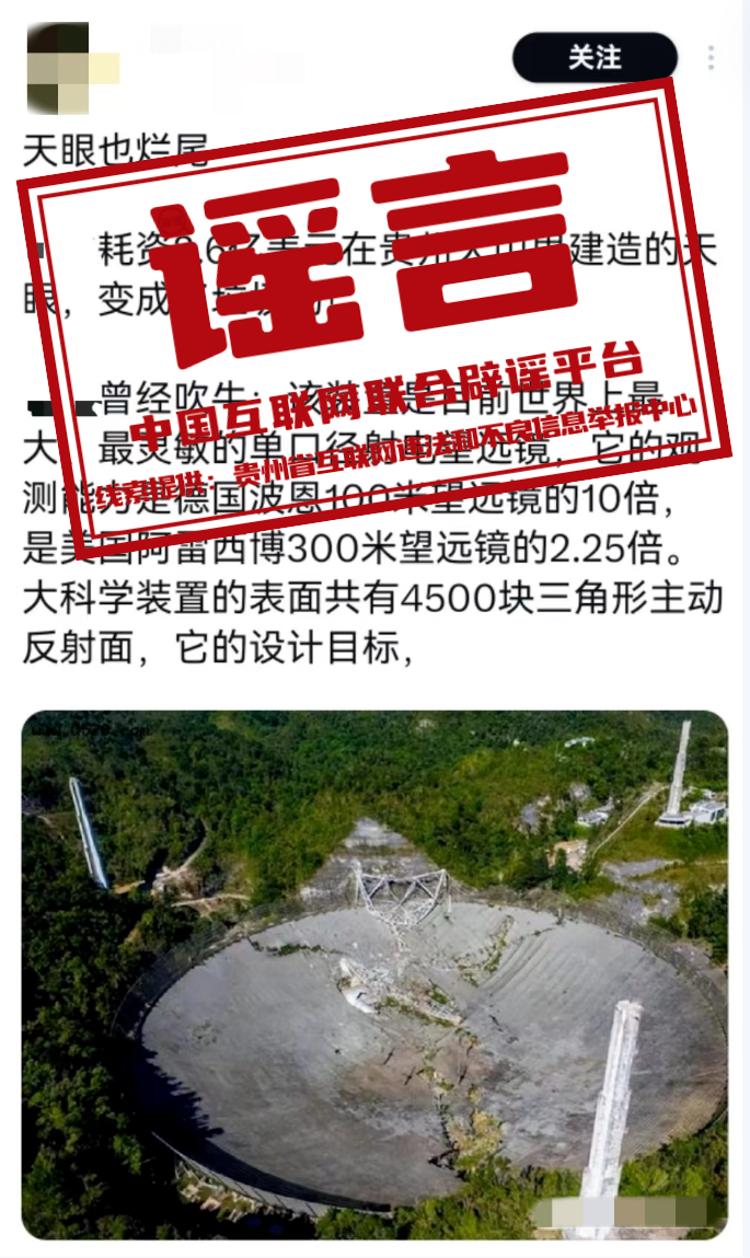 真相:近日,海外社交平臺(tái)有網(wǎng)民發(fā)布一張圖片,聲稱“耗資2.6億美元在貴州大山里建造的天眼,變成了垃圾場(chǎng)!”對(duì)此,“貴州辟謠”官方微信公眾號(hào)發(fā)布消息稱,網(wǎng)傳說(shuō)法為謠傳,網(wǎng)傳圖片實(shí)為美國(guó)波多黎各的阿雷西博天文臺(tái)(Arecibo Observatory)于2020年12月發(fā)生徹底坍塌的畫面,該天文臺(tái)主要的觀測(cè)裝置為阿雷西博射電望遠(yuǎn)鏡。事實(shí)上,這并非“中國(guó)天眼”第一次“被坍塌”,2020年阿雷西博望遠(yuǎn)鏡第一次出現(xiàn)嚴(yán)重?fù)p壞之際,網(wǎng)絡(luò)中就曾出現(xiàn)過類似謠言。