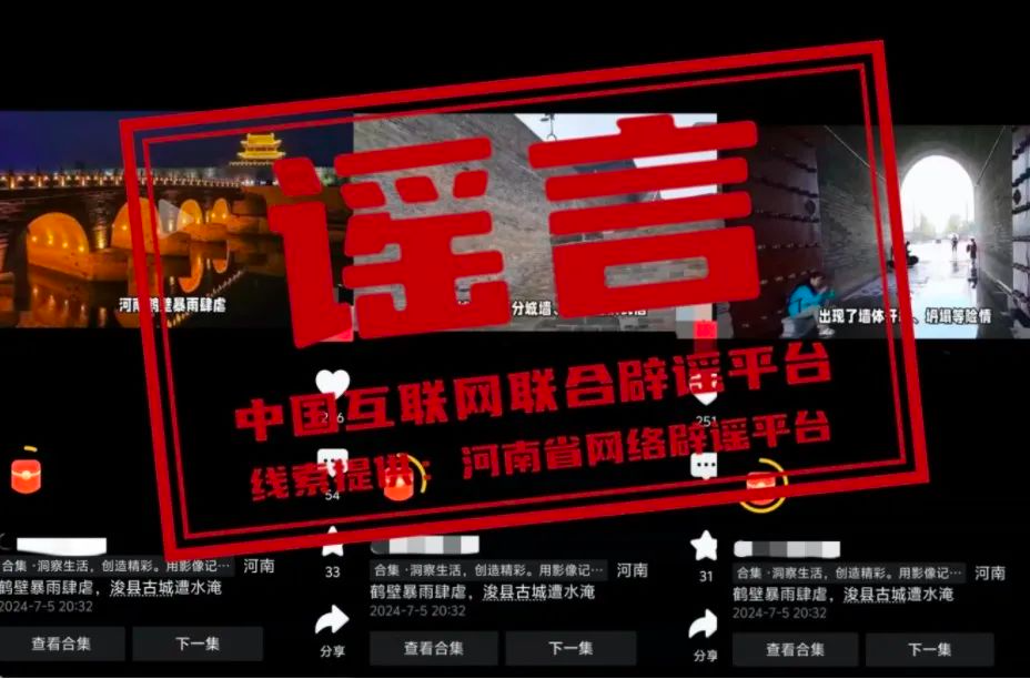真相:近日,有網(wǎng)民在網(wǎng)絡(luò)平臺發(fā)布內(nèi)容為“河南鶴壁暴雨肆虐,??h古城遭水淹”的視頻信息,引發(fā)社會關(guān)注。經(jīng)核實,7月5日浚縣出現(xiàn)暴雨天氣,強降雨期間浚縣古城北大街、東城門廣場等處出現(xiàn)積水情況,經(jīng)過積極排澇,雨停后路面積水很快被排空,恢復(fù)正常通行,不存在視頻中所說的“古城風(fēng)貌受損嚴(yán)重”“古城內(nèi)的部分城墻、古街巷出現(xiàn)不同程度的損毀”“古城墻出現(xiàn)了墻體開裂、坍塌等險情”“古城內(nèi)的博物館、紀(jì)念館等文化設(shè)施也遭受不同程度的損失”等現(xiàn)象。該視頻多為當(dāng)?shù)嘏f聞及外地視頻嫁接拼湊。目前,??h古城秩序正常。(來源:河南省網(wǎng)絡(luò)辟謠平臺、??h古城保護建設(shè)服務(wù)中心)
