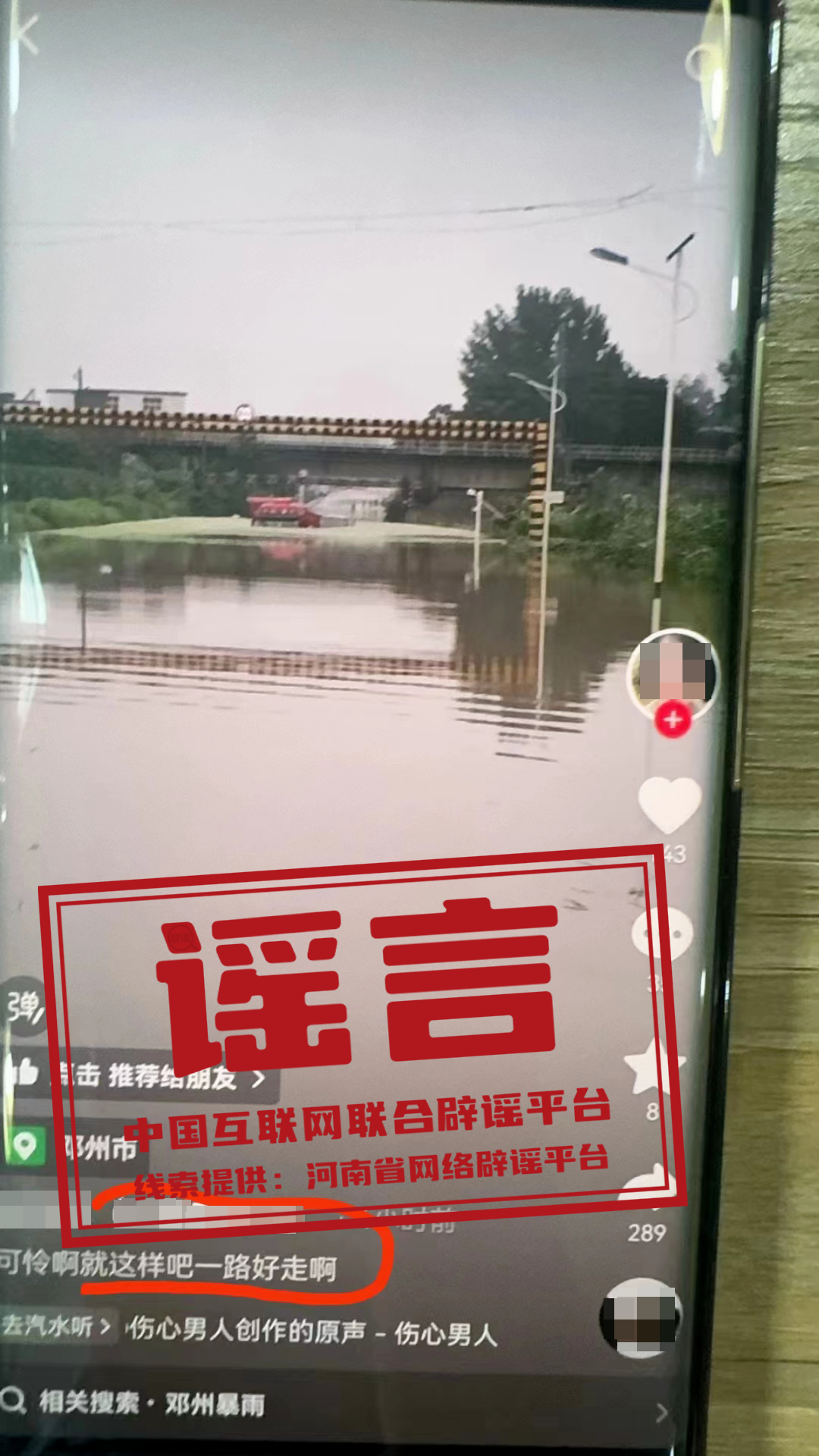 7月15日,網(wǎng)民“神x”在某短視頻平臺發(fā)布“貨車司機被淹”視頻,并配文稱“可憐啊,就這樣吧,一路好走”。經(jīng)核實,7月14日,鄧州市鐵路橋下一外地牌照貨車被淹,車內被困人員已被成功救出,無人員傷亡,該信息與事實嚴重不符,系虛假信息。