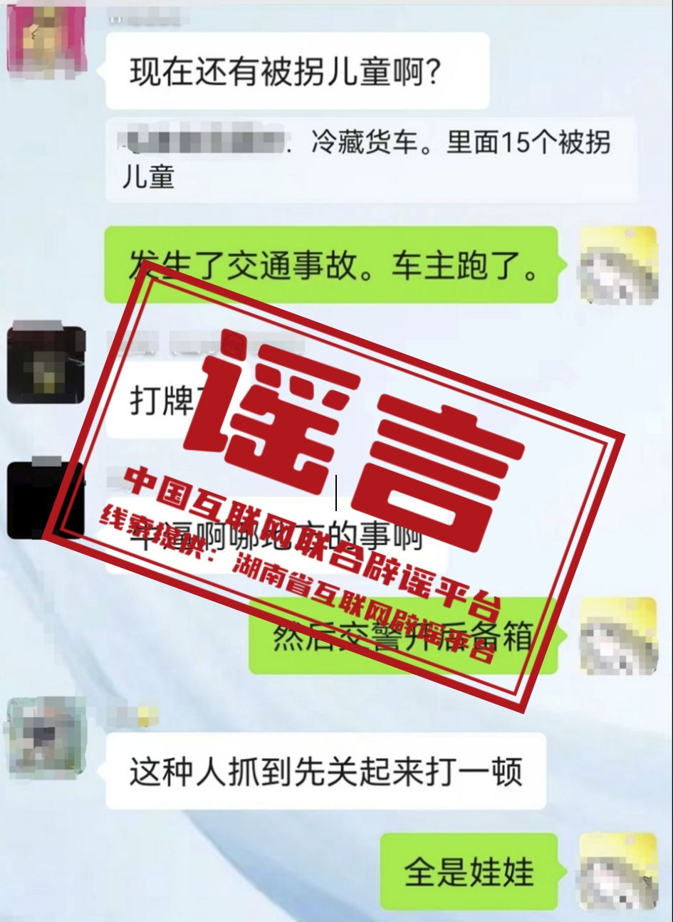 真相:9月4日,一則“湖南一冷藏車發(fā)生交通事故,交警在車上發(fā)現(xiàn)15名被拐兒童”的消息在網(wǎng)絡(luò)社交平臺(tái)傳播,引發(fā)網(wǎng)民關(guān)注。5日,湖南省湘潭市公安局雨湖分局發(fā)布警情通報(bào),“經(jīng)公安機(jī)關(guān)查證,該信息系謠言”。目前,虛構(gòu)事實(shí)擾亂公共秩序的違法行為人朱某已被公安機(jī)關(guān)依法行政拘留。(來(lái)源:“湖南省互聯(lián)網(wǎng)舉報(bào)中心”微信公眾號(hào)、“雨湖公安”微信公眾號(hào))