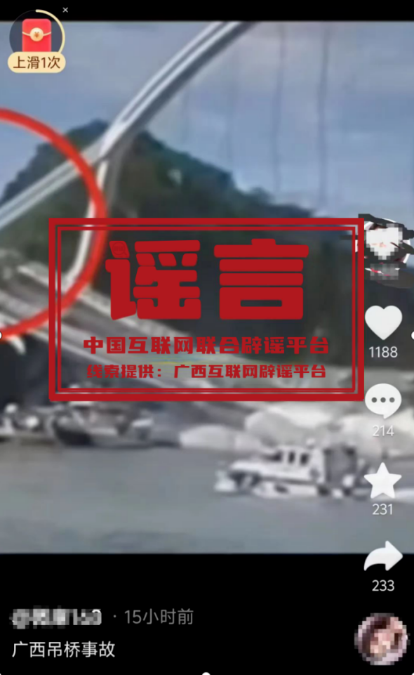 真相:近日,有網(wǎng)民在短視頻平臺(tái)發(fā)布內(nèi)容為吊橋垮塌事故的視頻,并稱該事故發(fā)生在廣西境內(nèi),引發(fā)網(wǎng)民關(guān)注。視頻顯示,一吊橋繩索斷裂導(dǎo)致橋體垮塌,一輛來不及過橋的貨車也落入水中。經(jīng)廣西互聯(lián)網(wǎng)辟謠平臺(tái)核實(shí)比對(duì),網(wǎng)傳“廣西吊橋垮塌事故”視頻實(shí)際上為2019年臺(tái)灣南方澳大橋發(fā)生吊桿斷裂并導(dǎo)致橋梁垮塌。網(wǎng)傳視頻系移花接木造謠。(來源:“廣西互聯(lián)網(wǎng)違法和不良信息舉報(bào)中心”微信公眾號(hào))